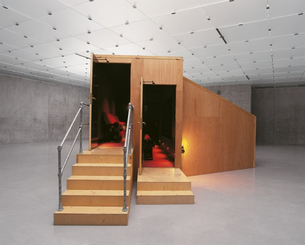 This installation follows the artists studies of the “physical aspect of sound," its carnal effect on the body, not its narrative connotations. In realising the embodied architecture of sound,"What is more particular about the installation is the personal binaural “surround sound” that every individual in the audience experiences through the headphones. The sense of isolation each might feel is broken by intrusions seemingly coming from inside the theatre. A cellphone belonging to a member of the audience rings. A close “female friend” whispers intimately in your ear: “Did you check the stove before we left?” Fiction and reality become intermingled as absorption in the film is suspended and other realities flow in." (Cardiff, Miller)
